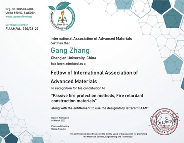 2022年4月6日,永利集团304am登录张岗教授当选国际先进材料协会(International Association of Advanced Materials,IAAM)会士(FIAAM),以表彰其在“桥梁结构智能防火新方法与新材料”领域做出的突出贡献。张岗教授应邀做了“IAAM Fellow Lecture 2022”的会士报告,着重介绍了研究团队在智能纤维混凝土的熔热阻爆机制和高性能组合结构桥梁抗火与防护新技术方面的系统工作。
