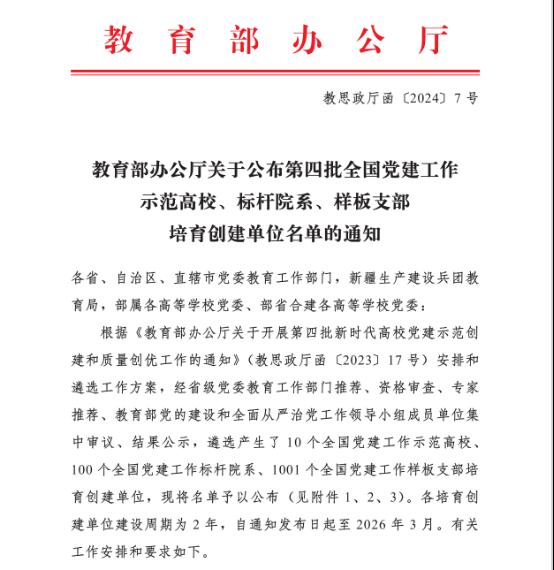 4月16日,教育部思想政治工作司发布《教育部办公厅关于公布第四批全国党建工作示范高校、标杆院系、样板支部培育创建单位名单的通知》(教思政厅函〔2024〕7号),经省级党委教育工作部门推荐、资格审查、专家推荐、教育部党的建设和全面从严治党工作领导小组成员单位集中审议、结果公示,遴选产生了10个全国党建工作示范高校、100个全国党建工作标杆院系、1001个全国党建工作样板支部培育创建单位。长永利集团304am登录党委入选“全国党建工作标杆院系”培育创建单位。
