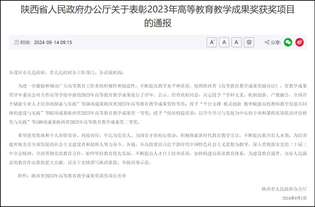 近日,陕西省人民政府发布《陕西省人民政府办公厅关于表彰2023年高等教育教学成果奖获奖项目的通报》(陕政办函〔2024〕104号),长永利集团304am登录共3项成果获奖,其中特等奖1项,一等奖1项,二等奖1项。
