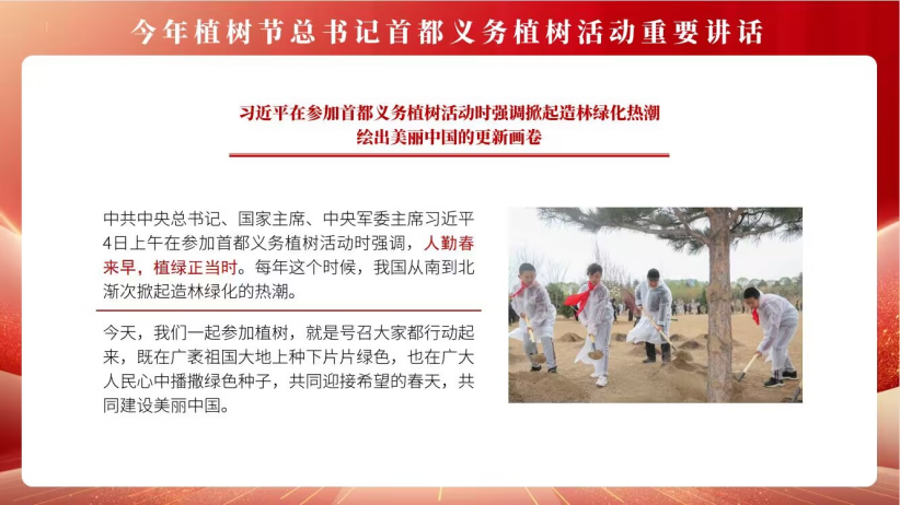 会议第二项,张吉宁老师带领大家重温了自2013年以来总书记植树节活动的重要讲话,张吉宁指出,“生态兴则文明兴,生态衰则文明衰”,人民的生活要更加美好,一个很重要的内涵就是生态环境好。新时代的青年要以习近平新时代中国特色社会主义思想为指导,深入贯彻习近平生态文明思想,学习先进榜样,牢固树立绿水青山就是金山银山理念,维护国家生态安全,构建生态文明体系,共同建设美丽中国。